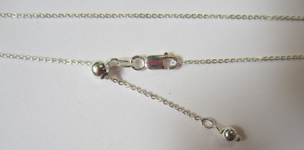 Description: Solid 925 Sterling Silver with Rhodium Plate Adjustable Cable Necklace up to 22" long. There is a rubber stopper inside the sterling silver ball that goes through the chain. It is tight enough to hold the chain in the length you want by sliding the ball back and forth up to 22" long.