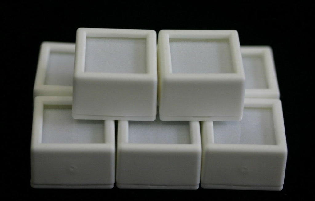 Description: 12 pcs of Glass top Square White Gem Jars with Back to Back white and black foam. Perfect to store or display gemstones, coins or valuables that will fit into the 1 1/16" size.