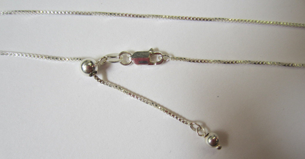 Description: Solid 925 Sterling Silver with Rhodium Plate Adjustable Box Necklace up to 22" long. There is a rubber stopper inside the sterling silver ball that goes through the chain. It is tight enough to hold the chain in the length you want by sliding the ball back and forth up to 22" long.
