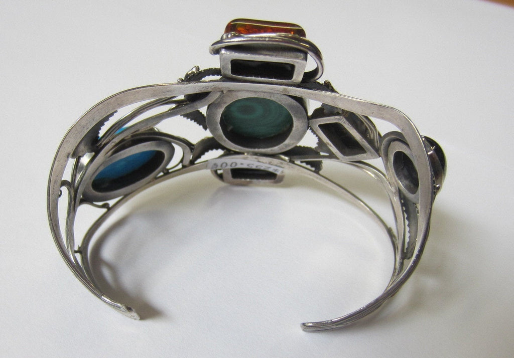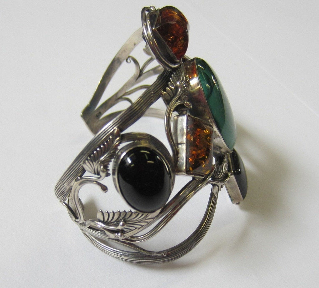 Description: Sterling Silver Handmade Multi-Stone Bangle Cuff Adjustable Bracelet. Handmade with unique style. Multi Natural Cabochons 1pc 22x30mm Oval Malachite, 2pcs 10x14mm Rectangle Amber, 1pc 18x25mm Oval Howlite Turquoise, 1pc 12x16mm Oval Black Onyx and 1pc 12x16mm Rectangle Black Onyx. Handmade Sterling Silver leaves accent the Cabochons. Great looking Cuff.