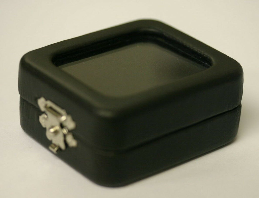 Description:  Glass top Black Faux Leather Gem Jars with Back to Back white and black foam.  Gem Jar/Box has lock/hinged.  Perfect to store or display gemstones, coins or valuables that will fit into the 2 3/8" size.