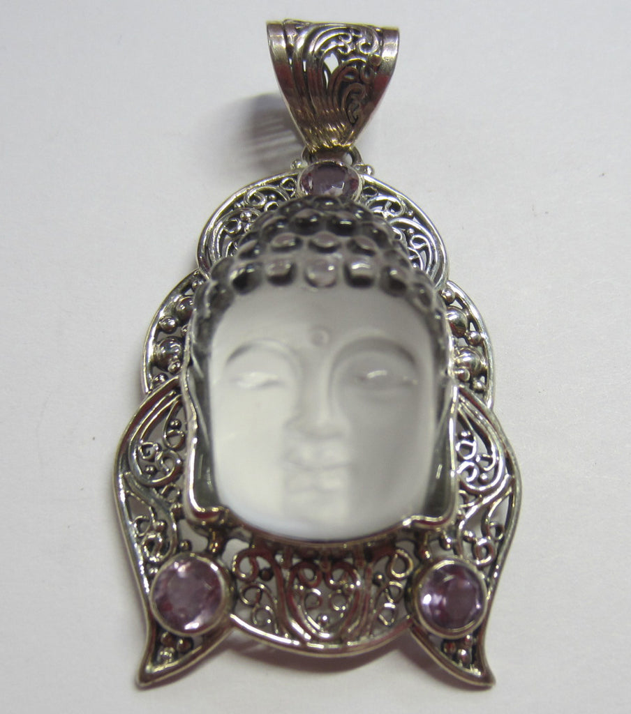 Item: Solid 925 Sterling Silver Pendant with with Buddha Face and Amethyst Gemstones Pendant
