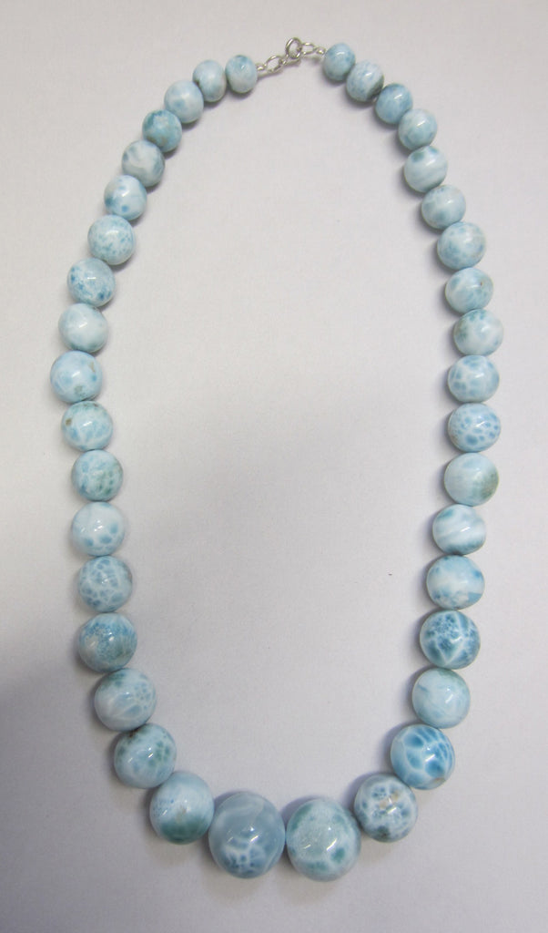 Description: Natural Larimar Round Beads Necklace in Sterling Silver Clasp. Graduated