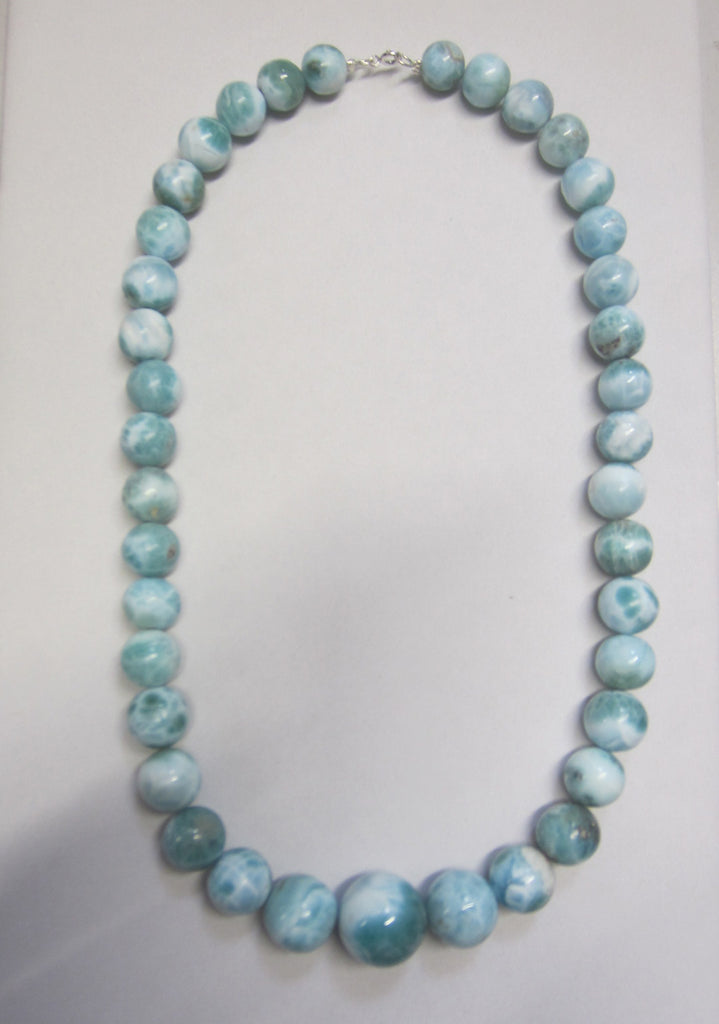 Description: Natural Larimar Round Beads Necklace in Sterling Silver Clasp. Graduated