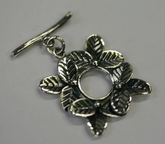 Description: Sterling Silver Toggle Ring and Bar Clasp with Flower Leaves Design. Solid 925 Sterling Silver. Great clasp for necklace or bracelet. The flower design enhances the look of your jewelry