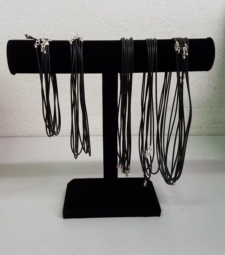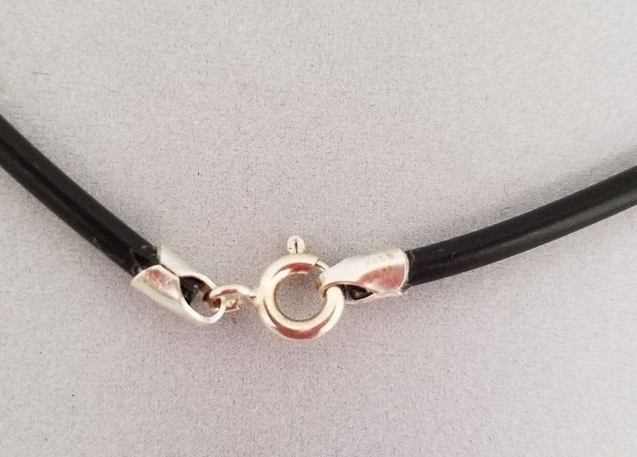Description: Our own 2.5mm Neoprene Necklaces with 100% Sterling Silver Spring Ring Clasps. We used high quality Spring Ring Clasps and Endcaps with anti-tarnish coating. Assembled in the United States. Your choice of length in 16" to 24". Pendant not included.