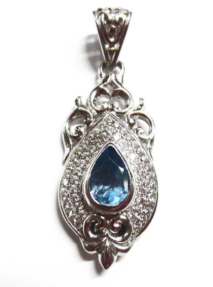 Description: Sterling Silver Silver Blue Faceted Swiss Pear Topaz and CZ Gemstones Pendant. High Quality Solid 925 Sterling Silver Pendant. Natural Swiss Topaz Gemstones.